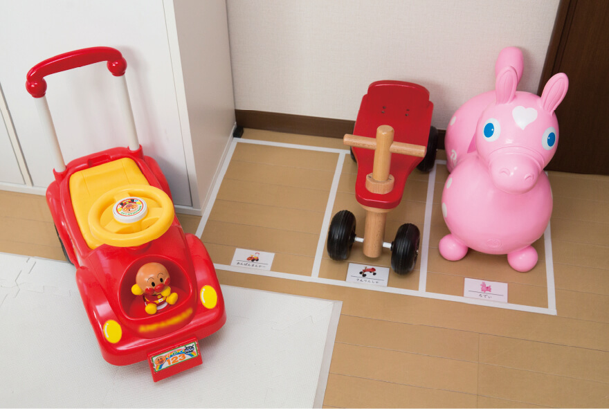 捨てるモノではなく、好きなモノを選ばせることです。例えば、おもちゃ。「どれを捨てる?」と聞くと、子どもは急に見向きもしなかったおもちゃで遊び始めたりするんですね。そうではなく「好きなおもちゃベスト10を教えて」と聞くと、楽しいし、自分の中で優先順位が決まるから、選んだモノを大切にする気持ちが生まれます。あとは、楽しめる仕組みをつくること。玄関で脱いだ靴を揃えるのに、その子の好きな色の足跡シールをつくって名前を書いて貼る。これだけで、きちんと靴を揃えるようになります。乗用玩具も、部屋の隅に白いテープで駐車場をつくるだけで、そこに戻してくれます。要は「元に戻す場所」を、子どもと相談しながら決めてあげることが大切なんです。
