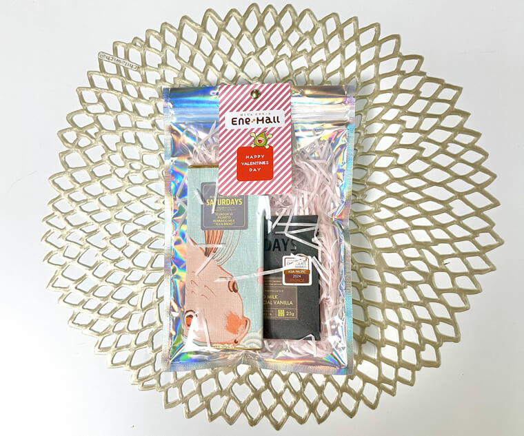 プレゼントするチョコレートは、今シーズンの新作で、複雑なフレーバーが魅力のカカオの個性からインスパイヤーされ、アールグレイと全粒粉パンを加え仕上げた贅沢なミルクチョコレートのEcuador Hokkado Milk Tea & Bread (フルサイズ55g)、インターナショナル・チョコレート・アワード2024で受賞したHokkaido Milk Uganda 60 Special Vanila (ハーフサイズ25g) を組み合わせた2枚セット。