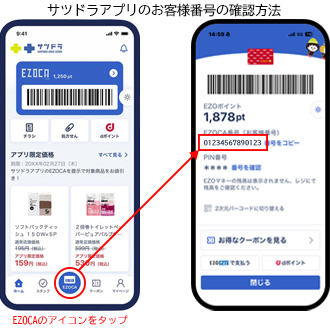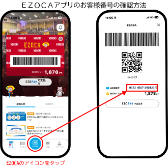 また、サツドラアプリ・EZOCAアプリの方は、下段のEZOCAのアイコンを押して頂くとお客様番号が表示されます。